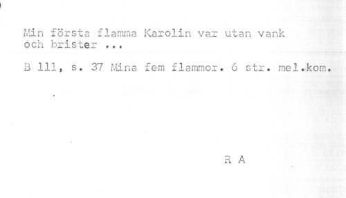 //// Min första flamma Karolin var utan vank och brister //// B 111, s. 37 Mina fem flammor. 6 str. mel.kom. » //// R A ////