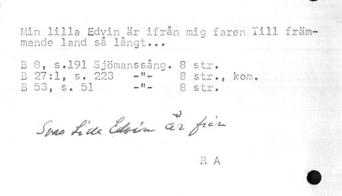 //// Min lilla Edvinoär ifrån mig faren Till främmande land så långt... //// B 8, s.191 Sjömanssång. 8 str. B 27:1, s. 223 8 str., kom. //// B 53, s. 51 8 str. //// R A ////