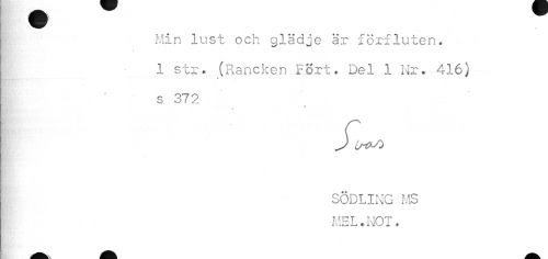 //// ¦ B) //// Min lust och glädje är förfluten. //// i //// 1 str. (Rancken Fört. Del 1 Nr. 416) s 372 //// f //// J Lrf"0 //// SÖDLING MS MEL.NOT. ////