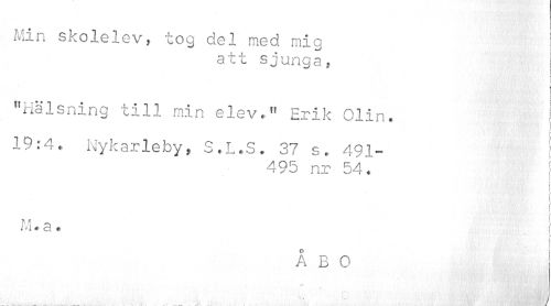 //// Min skolelev, tog del med mig //// att sjunga, //// < //// "Hälsning till min elev." Erik Olin. j //// 19:4. Nykarleby, S.L.S. 37 s. 491- //// 495 nr 54. j //// i I i //// ¦ i //// i' i * a * | //// > //// ÅBO //// .-i t ' //// 4 • ////