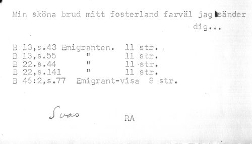 //// Min sköna brud mitt fosterland farväl jagfcsänder //// • dig €•. //// B 13,s,43 Emigranten. 11 str. . B 13,s.55 " 11 str. //// B 22.S.44 " 11 str. //// B 22}s.l41 " 11 str. //// B 46:2,s.77 Emigrant-visa 8 str. //// * //// fL^ RA //// s ////