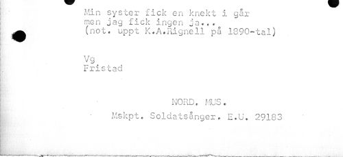 //// i • Min syster fick en knekt i går //// i men jag fick ingen ja... //// ! ^ (not. uppt K.A.Rignell på 1890-tal) //// Vg //// Fristad //// i //// I'* //// R; ' ¦p //// \ NORD. f./LrS . //// I Mskpt. Soldatsånger. E.U. 29183 //// * ////