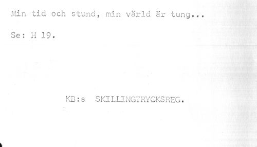 //// Min tid och stund, min värld är tung... //// ¦ 'V'vt //// Se: H 19. //// KB:s SKILLINGTRYCKSREG. //// //// /I ////