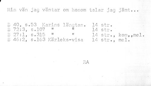 //// Min vän jag väntar om honom talar jag jämt,.. //// B 40, s.53 Karins längtan. 14 str. B 72:3, s.107 ,f f1 14 str. //// B 27:1, s.315 " » 14 str., kom,,mel. //// B 46:2, s.163 Kärleks-visa 14 str., mel. //// » //// ra //// ¦ ////
