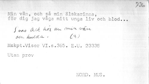 //// ¦ / v/b //// Min vän, och sä min älskarinna, //// för dig jag våga mitt unga liv och blod..» //// tuUcL*- C^) \ //// i i //// Mskpt.Visor VI.s.365. E.U. 23338 //// * « //// Utan prov //// i //// NORD. MUS. //// i ////