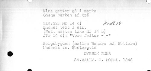 //// * //// Mina getter gå i marka Gnaga barken af/trä //// • Sid . 22. Nr 14 c) Endast text 1 str. (Mel. nästan lika Nr 14 b) Jfr 14 d): "Vore Jeiter - //// Bergsbygden (mellan Wenern och Wettern) Undenäs sn. Westergtld //// ^ DYBECK RUNA //// SV.VALLV. O. HORNL* 1846 ////