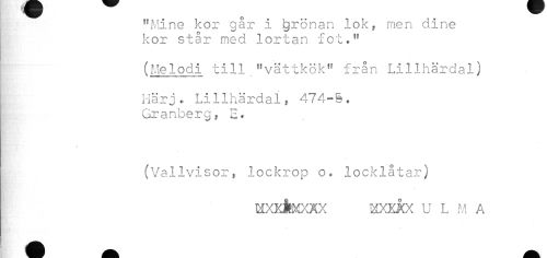 //// "Mine kor går i kronan lok, men dine kor står med lortan fot." //// (Melodi till."vättkök" från Lillhärdal) //// Härj. Lillhärdal, 474-§. //// Granberg, //// (Vallvisor, lockrop o. locklåtar) //// wxxMkxåx uxxkx u l m a ////