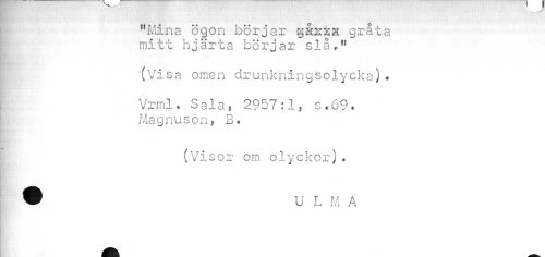 //// "Mina ögon börjar gåxtsc gråta mitt hjärta börjar slå," //// (Visa omen drunkningsolycka)* //// Vrml. Sala, 2957:1, s«69« Magnuson, B. //// (Visor om olyckor) * //// ¦I ////