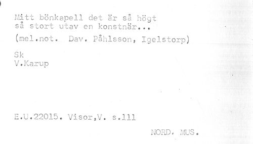 //// Mitt bönkapell det är så högt så stort utav en konstnär,., //// (mel.not. Dav, Påhlsson, Igelstorp) Sk //// V.Karup //// E.U.22015. Visor,V. s.lll //// NORD. MUS. ////