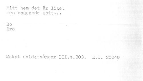 //// Mitt hem det är litet men naggande gott..* //// Bo Bro //// I . i //// Mskpt soldatsånger III.s.303. E.U. 25040 ////