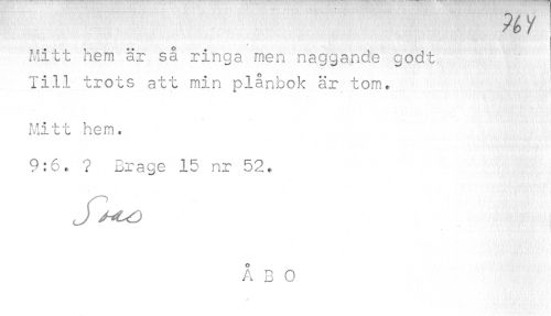//// uy //// * //// Mitt hem är så ringa men naggande godt Till trots att min plånbok är tom. //// Mitt hem. //// 9:6., ? Brage 15 nr 52. //// J /^D //// A B 0 ////