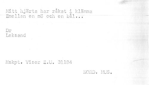 //// Mitt hjärta har råkat i klämma Emellan en mö och en bål,». //// Dr //// Leksand //// Mskpt. Visor E.U. 31184 //// NORD. MUS. ////
