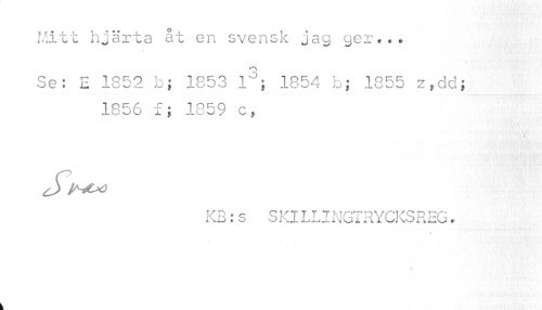 //// Mitt hjärta åt en svensk jag ger... //// Se: E 1852 b; 1853 l3; 1854 b; 1355 z,dd; //// 1856 f; 1859 c, //// KB:s SKILLINGTRYCKSREG. //// it //// i ////