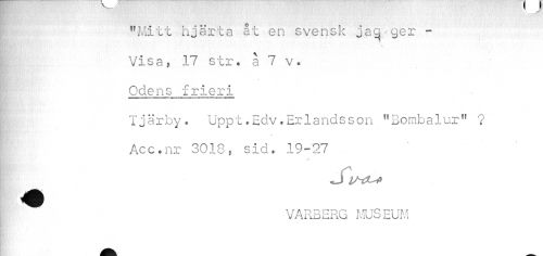 //// "Mitt hjärta åt en svensk jag ger -Visa, 17 str. a 7 v. Odens frieri //// Tjärby. Uppt.Edv.Erlandsson "Bombalur11 ? Acc.nr 3018, sid. 19-27 //// BH " //// J //// f ^ VARBERG MUSEUM ////