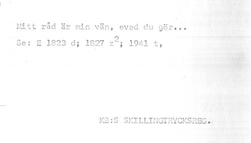 //// Mitt råd är min vän, evad du gör,,. Se: E 1823 d; 1827 z2; 1941 t, //// KB:S SKILLINGTRYCKSREG. ////