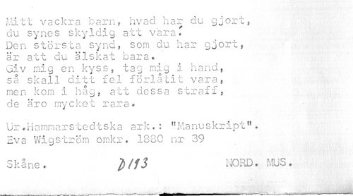 //// Mitt vackra barn, hvad har du gjort, du synes skyldig att vara T Den största synd, som du har gjort, är att du älskat bara. Giv mig en kyss, tag mig i hand, så skall ditt fel förlåtit vara, men kom i håg, att dessa straff, de äro mycket rara* //// Ur»Hammarstedtska ark.: "Manuskript". Zva Wigström omkr. 1880 nr 39 //// Skåne. })/f3 NORD. MUS. //// n ////