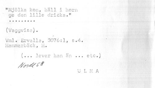 //// "Mjölka kon, häll i horn ge den lille dricka." //// » f t t i * r f » //// (Vaggvisa). //// .« //// Vml. Ervalla, 3076:1, s.4. //// Hammarbäck, H. //// (., . lever han än .. .. etc .) //// U L M A ////