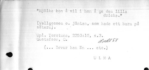 //// * . ' V ' • t: ' m m //// I "Mjölka kon å sil i hon å ge den lilla //// i dricka //// i (Vallgossen o. jäntan, som hade ett barn på //// | sä tern) • , * //// I Upl. Torstuna, 2253:10, s.3. //// Gustafson, G. jfadf?* //// (« . • lever han än .. • etc •) ^ U L M A //// ^^ A ////