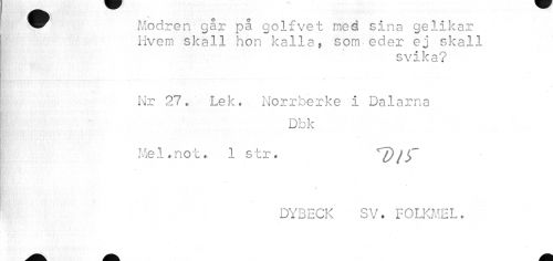 //// ^^ Modren gar pa golfvet med sina gelikar //// Hvem skall hon kalla, som eder ej skall //// svika? //// Nr 27* Lek, Norrberke i Dal ar na //// Dbk //// Me 1.not» 1 s t r. '~~D j f //// i t //// DYBECK SV. FOLKMEL. ////