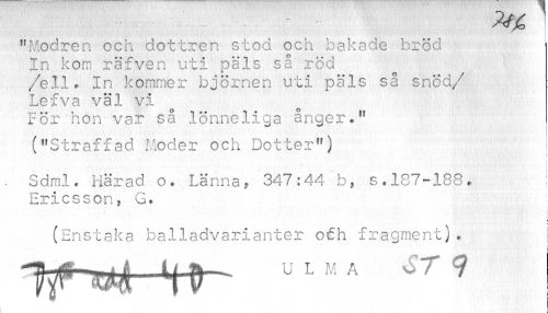 //// "fodren och dottren stod och bakade bröd 1 //// In kom räfven uti päls så röd /ell* In kommer björnen uti päls så snöa/ Lefva väl vi //// För hon var så lönneliga ånger." //// ("Straffad Moder och Dotter") ! //// • ¦ I //// { //// . Sdral. Härad o. Länna, 347:44 b, s.187-188. Ericsson» G. //// t //// (Enstaka balladvarianter o£h fragment)• | //// i ////