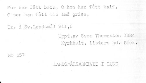 //// Mor har fått barn, Q kon har fått kalf, O son han fått tio små grisa, //// Tr* i Sv.Landsmål Vii,6 //// Uppt.av Sven Thomasson 1384 Kyrkhult, Listers hd. Blek. //// Nr 557 //// LANDSMÅLSARKIVET I LUND ////
