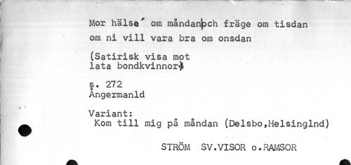 //// 'V-1 • //// Mor hälsa' om måndan|DCh fräge om tisdan om ni vill vara bra om onsdan //// (Satirisk visa mot lata bondkvinnor^ //// §• 272 Angermanld //// M < v //// Variant: //// Ä Kom till mig på måndan (Delsbo,Helsinglnd) //// V. Ä //// STRÖM SV.VISOR o.RAMSOR ////
