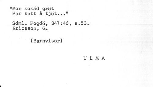 //// "Mor kokad gröt Far satt å tjöt»,." //// Sdml* Fogdö, 347:46, s.53. Ericsson, G* //// (Barnvisor) //// U L M A ////