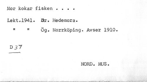 //// Mor kokar fisken . . . . //// Lekt.1941. Sr. Hedemora. //// n 11 Ög. Norrköping. Avser 1910. //// D 37 //// NORD. MUS. ////