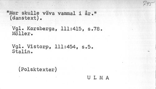 //// . ... . r / J //// "Mor skulle väva vamrnal i år." (danstext). //// Vgl. Korsberga, 111:415» s.78. j //// Möller. //// i //// i i //// Vgl. Vistorp, 111:454, s.5. Stalin. //// i i //// v //// ? //// • i //// (Polsktexter) //// U L M A ////