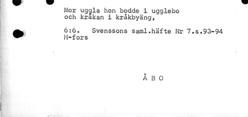 //// Mor uggla hon bodde i ugglebo och krakan i kråkbyäng, //// ^^ 6:6. Svenssons saml.häfte Nr 7.s.93-94 //// ~ H-fors //// s //// ÅBO //// X ////