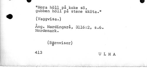 //// "Mora höll påokoke s8, gubben höll på stene sköta.11 //// jf k //// ^^ (Vaggvisa.) //// Ang. Nordingsrå, 3116:2, s.6. Nordemark. //// (Barnvisor) 413 U L M A //// v ////