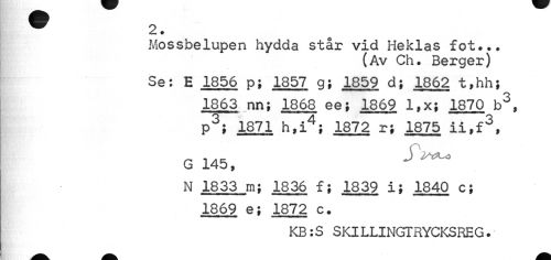 //// Mossbelupen hydda står vid Heklas fot... //// (Av Ch. Berger) //// Se: E 1856 p; 1857 g; 1859 d; 1862 t,hh; //// 1863 nn; 1868 ee; 1869 l,x; 1870 b3, //// P3; 1871 h,i4; 1872 r; 1875 ii,f3, //// G 145, W« //// N 1833 m; 1836 f; 1839 i; 1840 c; 1869 e; 1872 c. //// KB:S SKILLINGTRYCKSREG. ////