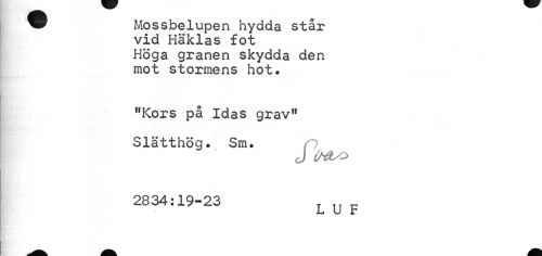 //// ^ Mossbelupen hydda står //// vid Häklas fot Höga granen skydda den mot stormens hot. //// "Kors på Idas grav" Slätthög. Sm. //// 2834:19-23 T 7T - //// Lur ////