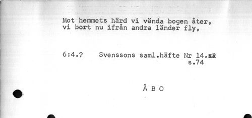 //// iV" * //// Mot hemmets härd vi vända bogen åter, vi bort nu ifrån andra länder fly, //// , v //// 6:4.? Svenssons saml.häfte Nr 14.säc //// s .74 //// • ÅBO //// \ ////
