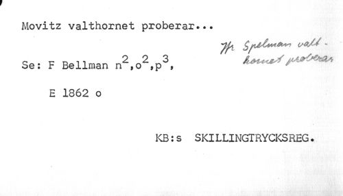 //// Movitz valthornet proberar... //// C)uti/* - //// Se: F Bellman n2,o2,p3, Uu^f^O^ //// E 1862 o //// KB:s SKILLINGTRYCKSREG. //// //// /