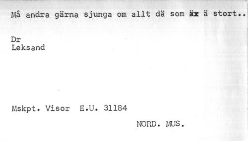 //// Ma andra gärna sjunga om allt dä som äx ä stort•• Dr //// Leksand //// ¦ //// Mskpt. Visor E.U. 31184 //// NORD. MUS. ////