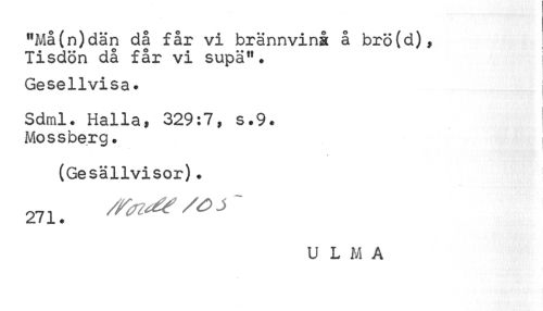 //// "Må(n)dan då får vi brännvinå å brö(d), Tisdön då får vi supä". //// Gesellvisa. //// Sdml. Halla, 329:7, s.9. Mossberg. //// (Gesällvisor). //// U L M A ////