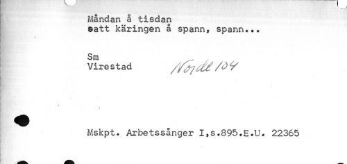 //// Måndan å tisdan //// ©att käringen å spann, spann.? . //// Vire stad /få dé /<> 9 //// * , //// 4 //// Mskpt. Arbetssånger I,s.895.E.U. 22365 ////
