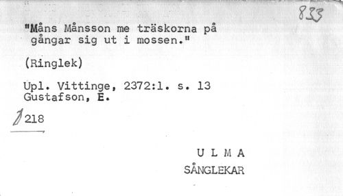 //// OJ //// "Måns Månsson me träskorna på gångar sig ut i mossen.11 //// (Ringlek) //// Upl. Vittinge, 2372:1. s. 13 Gustafson, E. //// / 218 //// f //// U L M A //// SÅNGLEKAR //// 4 ////
