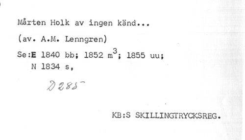 //// Mårten Holk av ingen känd... (av. A.M. Lenngren) //// Se:E 1840 bb; 1852 m3; 1855 uu; N 1834 s, //// 4 //// KB:S SKILLINGTRYCKSREG. ////