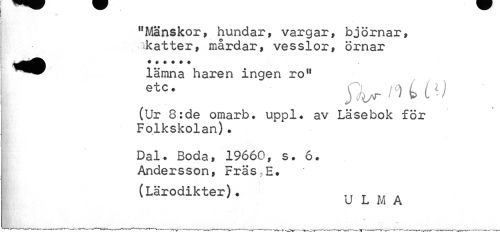//// "Mänskor, hundar, vargar, björnar, ikatter, mårdar, vesslor, örnar //// ^^^ lämna haren ingen ro" //// (Ur //// 8:de omarb. uppl* av Läsebok för Folkskolan). //// Dal. Boda, 19660, s. 6. Andersson, Fräs?E* //// (Lärodikter). y L M A ////