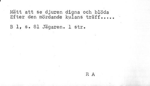 //// Mätt att se djuren digna och blöda Efter den mördande kulans träff..... //// « //// B 1 //// i s. 81 Jägaren. 1 str. //// R A ////