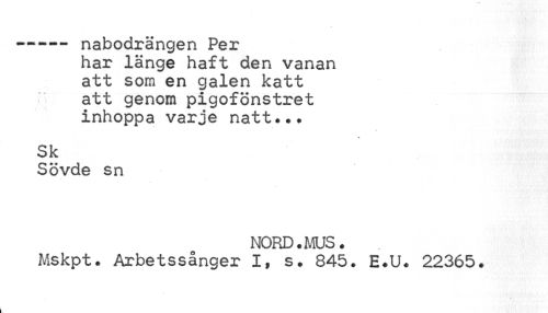 //// ----- nabodrängen Per //// har länge haft den vanan att som en galen katt att genom pigofönstret inhoppa varje natt#.# //// Sk //// Sövde sn //// NORD.MUS. //// Mskpt. Arbetssånger I, s. 845. E.U. 22365. ////