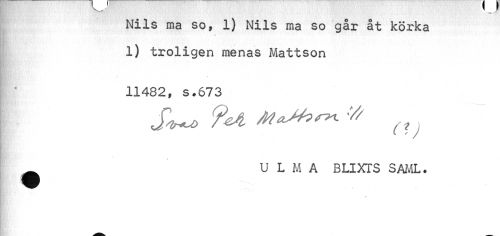 //// Nils ma so, 1) Nils ma so går åt körka //// « //// 1) troligen menas Mattson 11482, s.673 //// S^u> ?€& V //// /U L M A BLIXTS SAML. //// ? ////