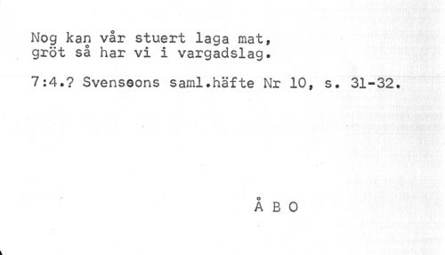 //// Nog kan vår stuert laga mat, gröt så har vi i vargadslag. //// 7:4.? Svenseons saml.häfte Nr 10, s. 31-32. //// % //// //// /ÅBO ////