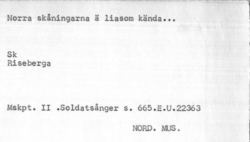 //// Norra skåningarna ä liasom kända.». //// | //// Sk //// Riseberga //// | //// Mskpt. II .Soldatsånger s. 665.E.U.22363 | //// i i i //// NORD. MUS. ////