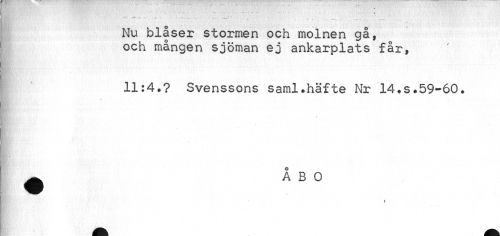 //// I //// Nu blåser stormen och molnen gå, och mången sjöman ej ankarplats får, //// 11:4.? Svenssons saml.häfte Nr 14.s.59-60. //// v //// * //// ^ ÅBO //// I ////