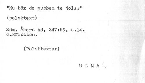 //// I //// "Nu bär de gubben te jola." (polsktext) //// , , ¦ i I //// Sdm. Åkers hd, 347:59, s.14. G.Ericsson. //// w //// ^•/¦y^mmgs/m \ //// (Polsktexter) //// U L M A \ //// 1 i -i' v.i Win • . ; //// j ' ////