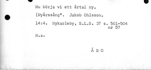 //// Nu börja vi ett årtal ny, ^ (Nyårssång11 • Jakob Ohlsson, //// 14:4. Nykarleby, S.L.S. 37 s. 501-504 //// nr 57 //// M.a. //// ÅBO ////