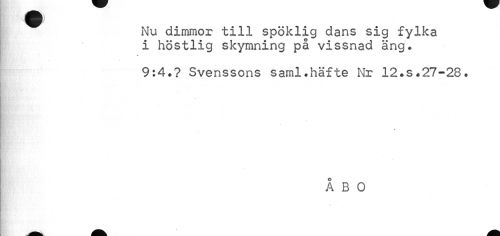 //// Nu dimmor till spöklig dans sig fylka i höstlig skymning på vissnad äng. //// 9:4.? Svenssons saml.häfte Nr 12.s.27-28. //// ÅBO ////